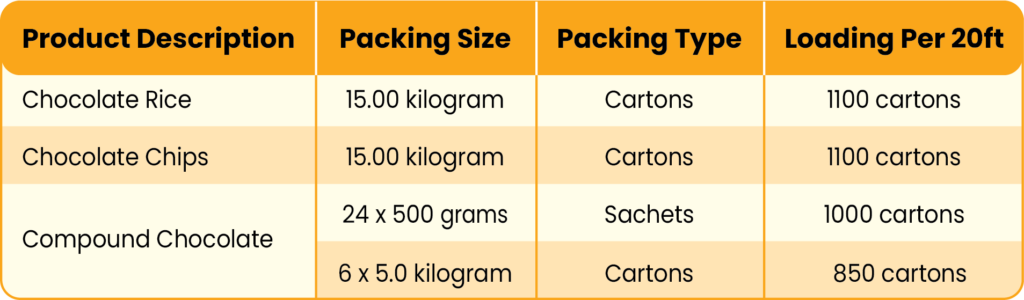 Its available in various forms and formulations to meet different processing requirement and cost considerations. These include chocolate paste, compound chocolate, chips, buttons and rice.