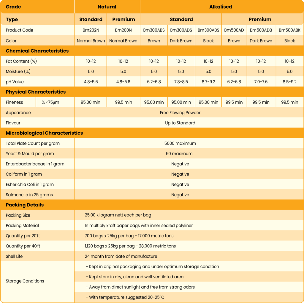 Cocoa Powder is a widely used food ingredient derived from cocoa cake and valued for its rich chocolate flavour, aroma and colour. It is produced by fermenting, drying, roasting and grinding cocoa beans into cocoa liquor and cocoa butter. The remaining is known as cocoa cake is finely milled to obtained the powder. Cocoa powder is available in Natural and Alkalised (Dutch-processed) forms. With good dispersion properties and consistent performance, both grades are suitable for dry and liquid applications such as bakery, beverages, confectionery and food manufacturing. Fat Content typically ranges from 10-12% with other grades available to meet specific processing needs.